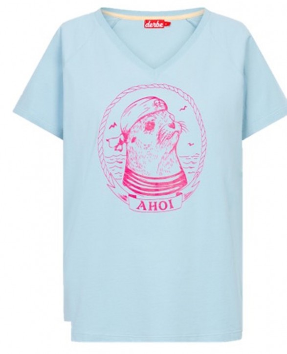 Hellblaues Derbe T-Shirt für Damen mit coolem Matrosen Robben Motiv in Pink. Ahoi ihr Landratten – Handgezeichnet zum Verlieben!
