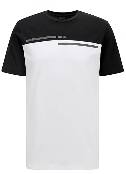 Gerade geschnittenes BOSS T-Shirt. Das Herren-Shirt aus elastischem Baumwoll-Jersey ist mit einem Streifen und einem Logo-Print auf der Brust versehen und verspricht einen legeren Look mit hohem Tragekomfort. Verleihen Sie Ihren Outfits mit diesem Top den charakteristischen BOSS Touch.